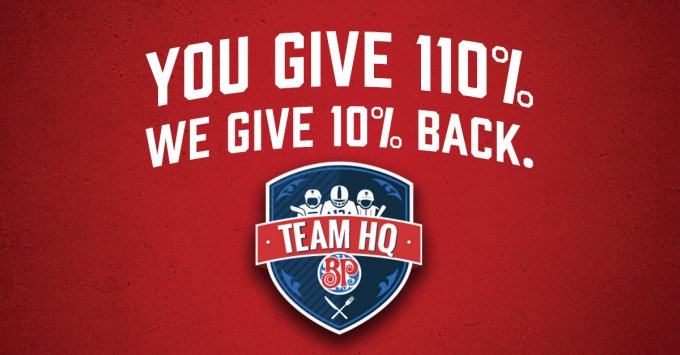 Team HQ is our way of supporting teams in the community – so get in on the action! Step up, sign up, and collect 10% of what you spend on each receipt at Boston Pizza. Use it for a post-game dinner or a post-season blowout party with your team